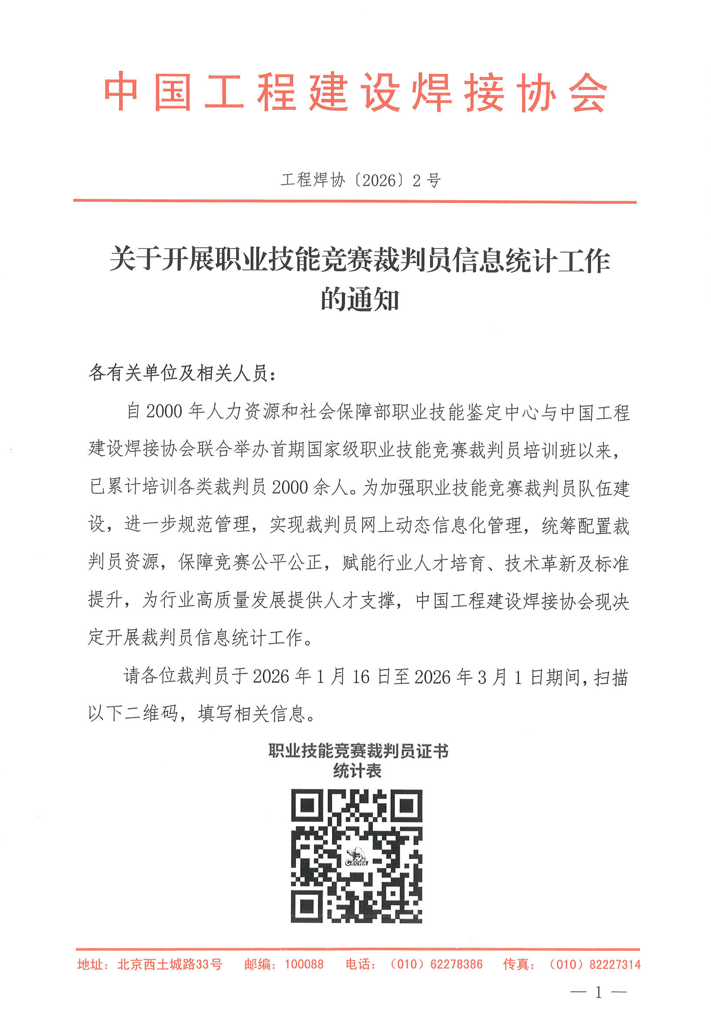 自2000年人力资源和社会保障部职业技能鉴定中心与中国工程建设焊接协会联合举办首期国家级职业技能竞赛裁判员培训班以来,已累计培训各类裁判员2000余人。为加强职业技能竞赛裁判员队伍建设,进一步规范管理,实现裁判员网上动态信息化管理,统筹配置裁判员资源,保障竞赛公平公正,赋能行业人才培育、技术革新及标准提升,为行业高质量发展提供人才支撑,中国工程建设焊接协会现决定开展裁判员信息统计工作。