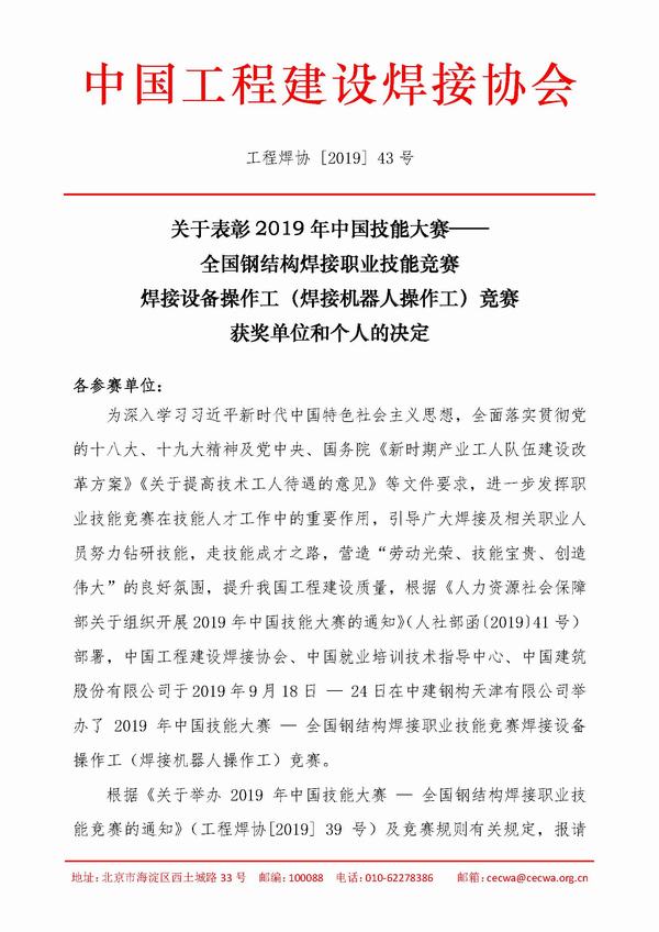 点击下载《2019年中国技能大赛——全国钢结构焊接职业技能竞赛焊接机器人操作工竞赛表彰决定》(工程焊协 [2019]43号)