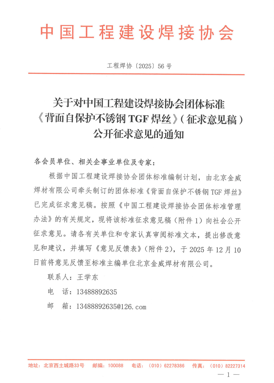 《背面自保护不锈钢TGF焊丝》(征求意见稿)公开征求意见的通知