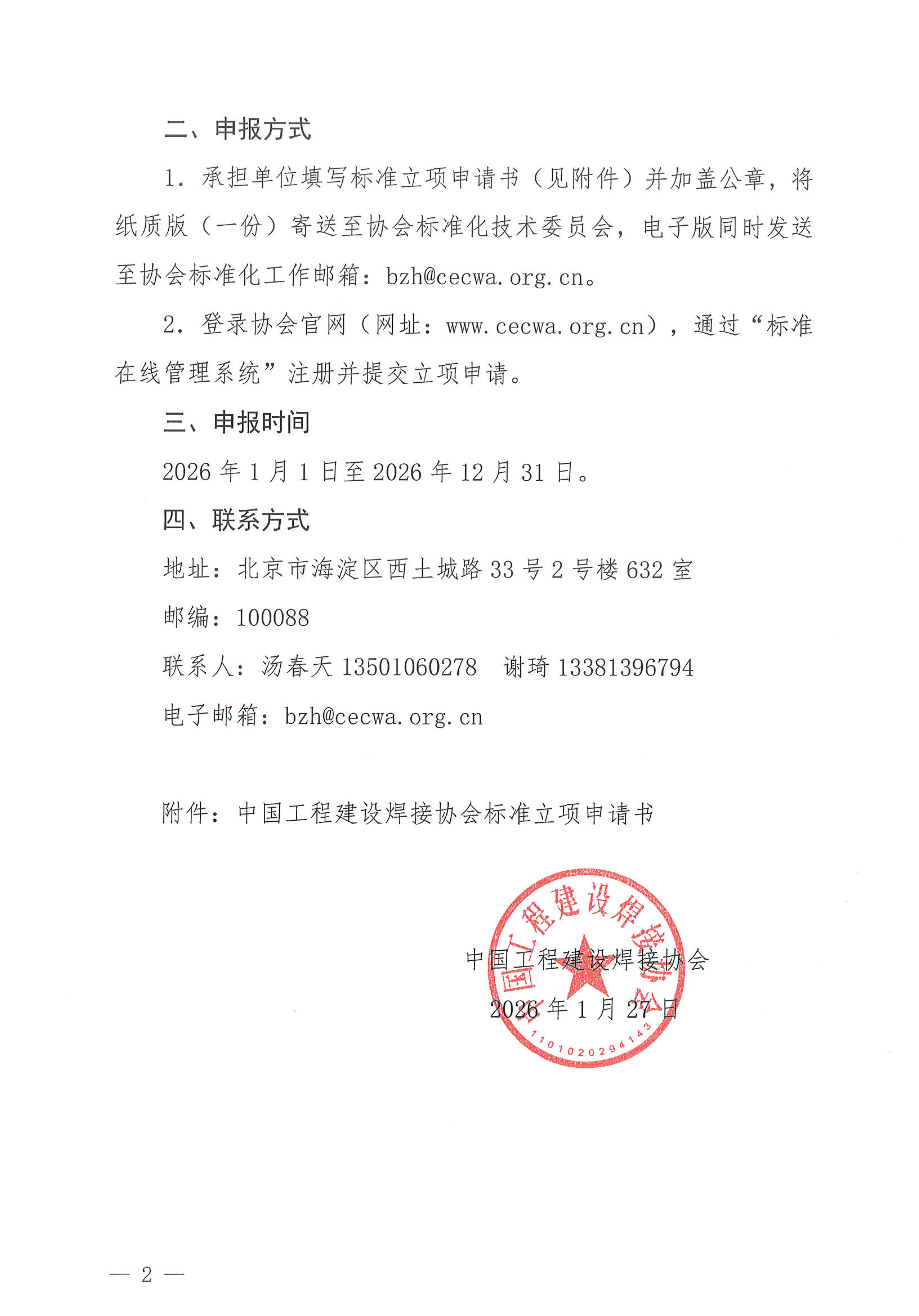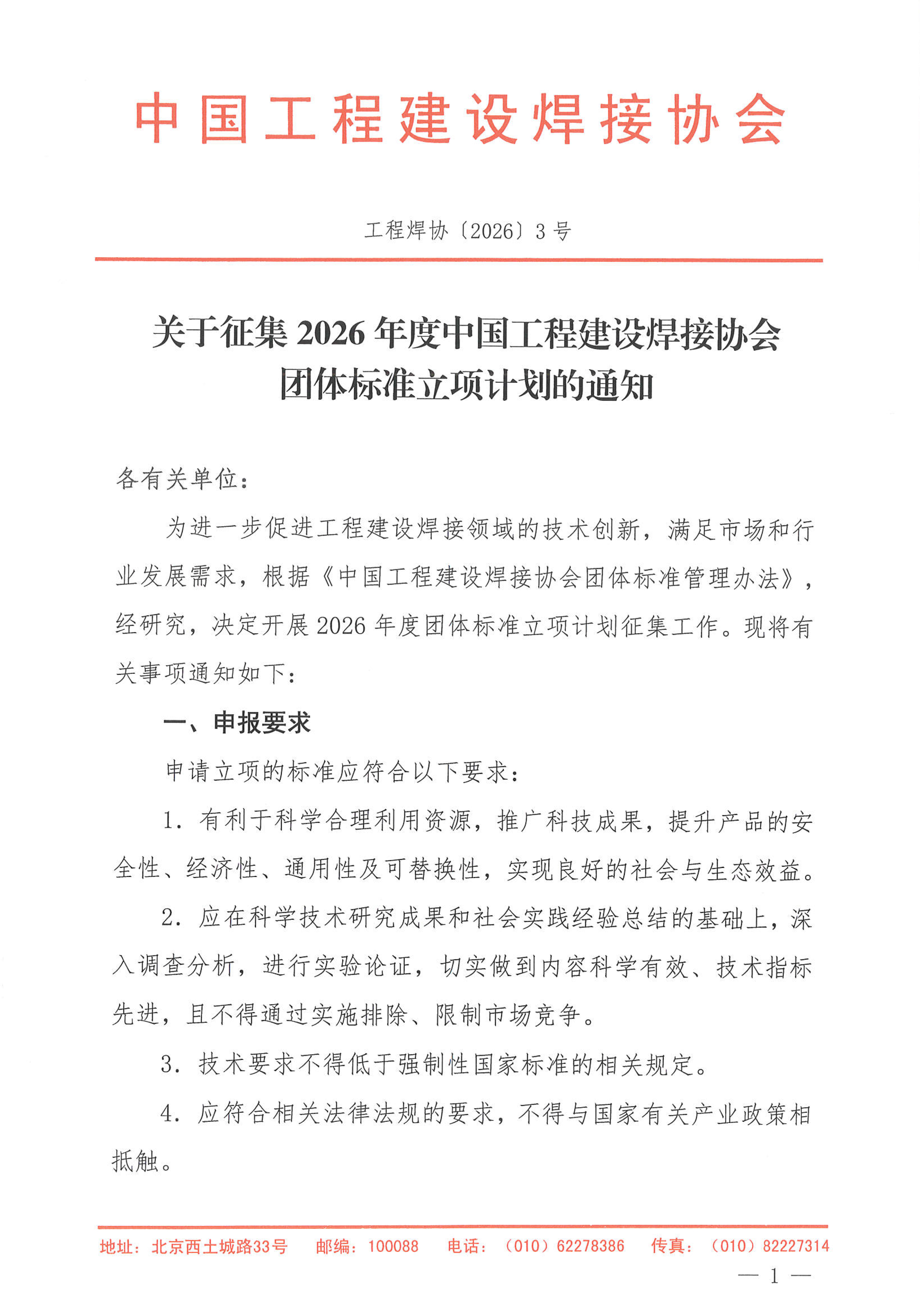 为进一步促进工程建设焊接领域的技术创新,满足市场和行业发展需求,根据《中国工程建设焊接协会团体标准管理办法》,经研究,决定开展2026年度团体标准立项计划征集工作。通知如下: